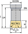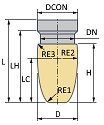 | Undercut Barrel Mill: OverallLength (L) Diameter (D) WorkingLength (WL) CenterLength (LC) Height (H) StemLength (LH) EdgeR1 (RE1) EdgeR2 (RE2) EdgeR3 (RE3) StemDiameter (DN) ConnectDiameter (DCON) |