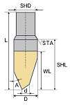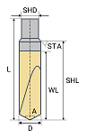 | Engraver: OverallLength (L) CuttingDiameter (D) WorkingLength (WL) ShankDiameter (SHD) ShoulderLength (SHL) ShankTaperAngle (STA) Angle (A) EndDiameter (d) |