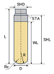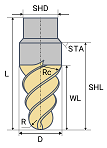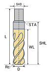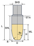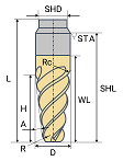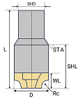 | Negative Radius Mill: OverallLength (L) CuttingDiameter (D) WorkingLength (WL) ShankDiameter (SHD) ShoulderLength (SHL) ShankTaperAngle (STA) Radius (Rc) |