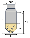 | Spot Drill: OverallLength (L) CuttingDiameter (D) WorkingLength (WL) ShankDiameter (SHD) ShoulderLength (SHL) ShankTaperAngle (STA) Angle (A) |