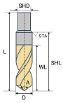 | Drill: OverallLength (L) CuttingDiameter (D) WorkingLength (WL) ShankDiameter (SHD) ShoulderLength (SHL) ShankTaperAngle (STA) Angle (A) |