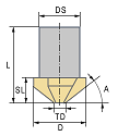 | Flat Tip Countersink: OverallLength (L) Diameter (D) WorkingLength (WL) ShaftDiameter (DS) TipDiameter (TD) ShoulderLength (SL) TipAngle (A) |