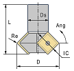 | Undercut Indexable Chamfer Mill: OverallLength (L) Diameter (D) WorkingLength (WL) StemDiameter (Ds) InsertAngle (Ang) InsertInnerCircleDiameter (IC) InsertCornersCount (CNC) CornerRadius (Re) |
