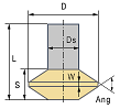 | Undercut Sharp Chamfer Mill: OverallLength (L) Diameter (D) WorkingLength (WL) Height (S) Angle (Ang) Width (W) StemDiameter (Ds) |