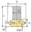 | Undercut Two Angle Mill: OverallLength (L) Diameter (D) WorkingLength (WL) Height (H) HeadHeight (H2) Angle1 (ang) Angle2 (ang2) SmoothRadius (R) ShaftDiameter (W) |