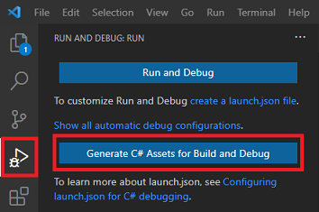 - Switch to the "Run and Debug" panel and press to the "Generate C# Assets for Build and Debug" button.