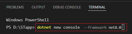 In the terminal view insert the "dotnet new console --framework net8.0" command and press enter (change the net8.0 version if you have a different SDK version).